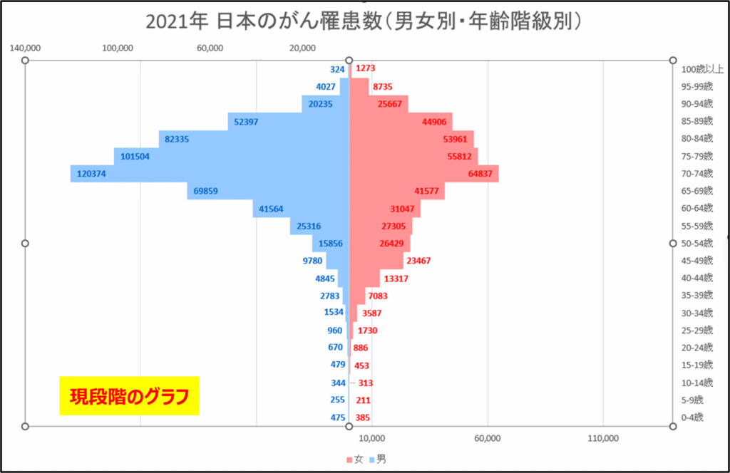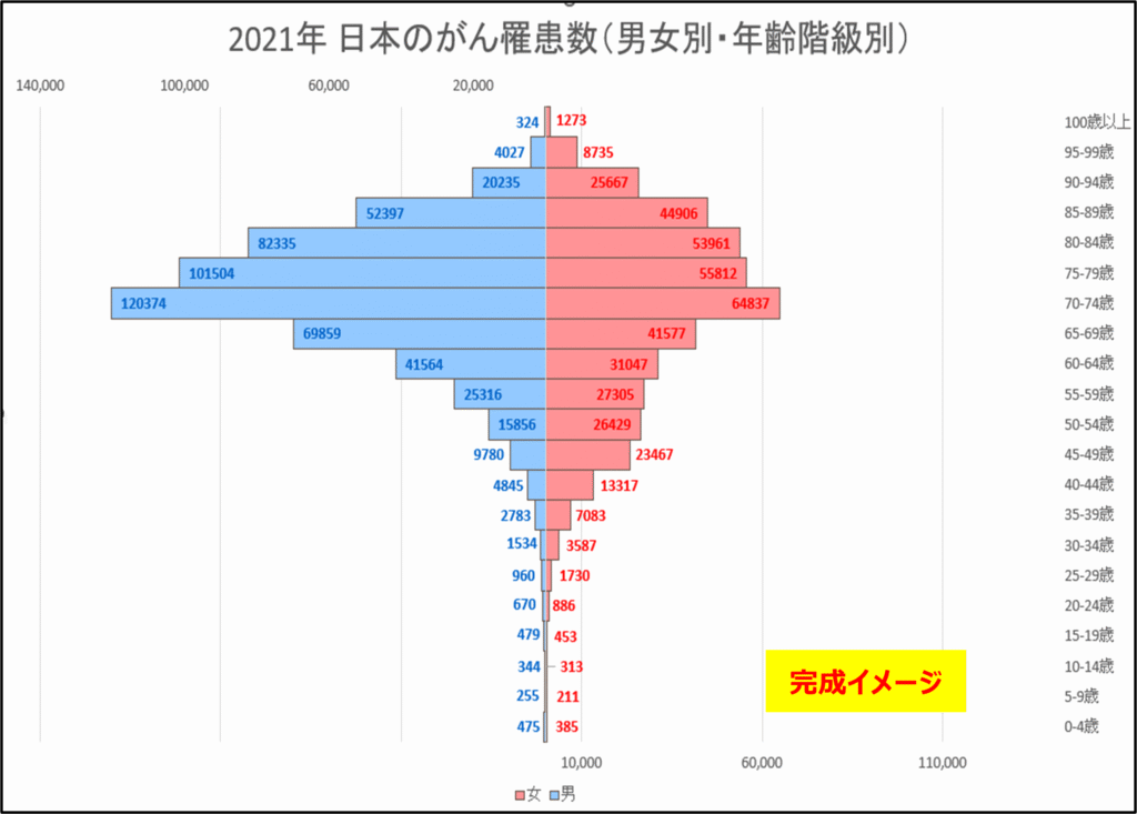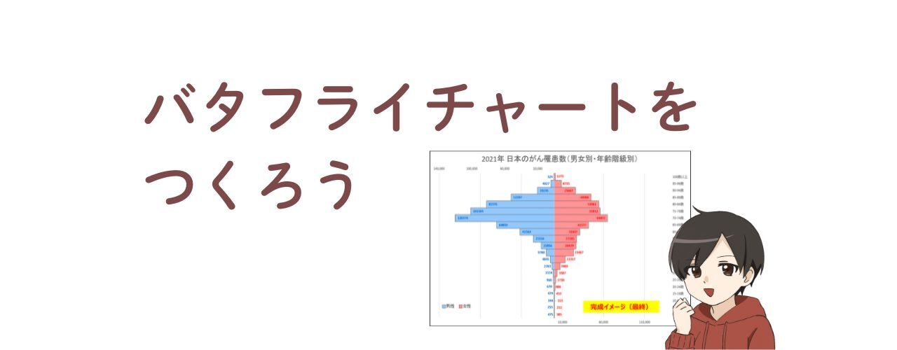 がん登録データを使って、男女別・年齢階級別の罹患数を視覚的にわかりやすく表す「バタフライチャート(トルネードグラフ)」を作成してみましょう。
