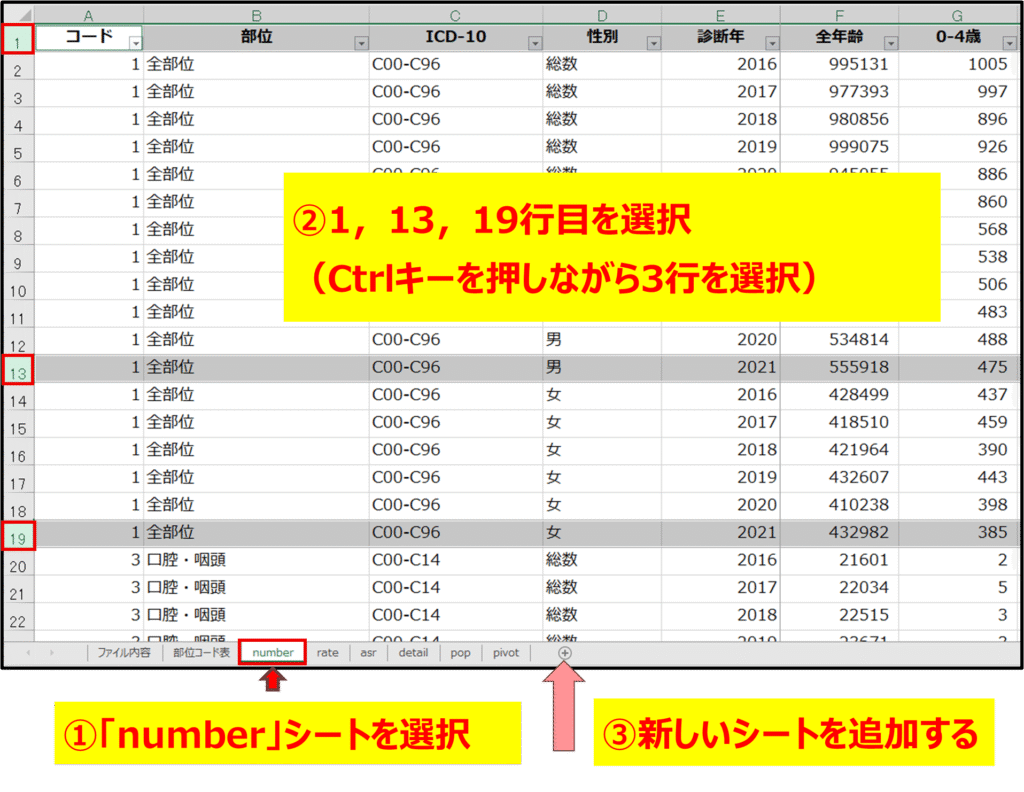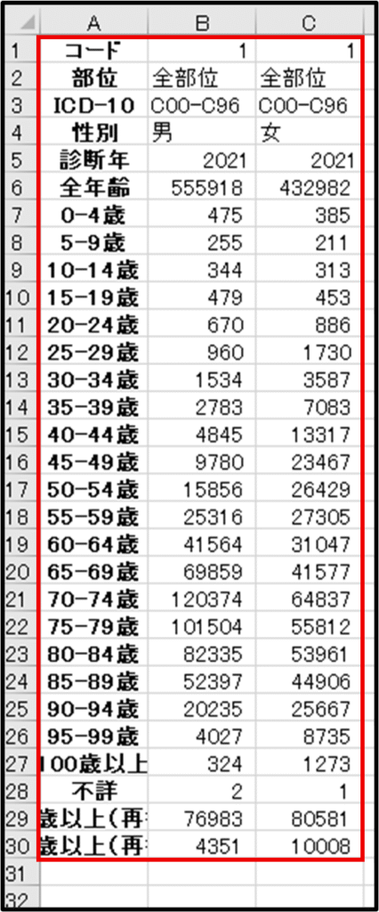 使用するのは、【2. がん登録データをダウンロード】 で入手したExcelファイルです。