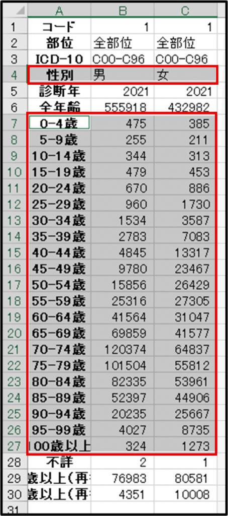 - 「年齢階級」の「0-4歳」~「100歳以上」