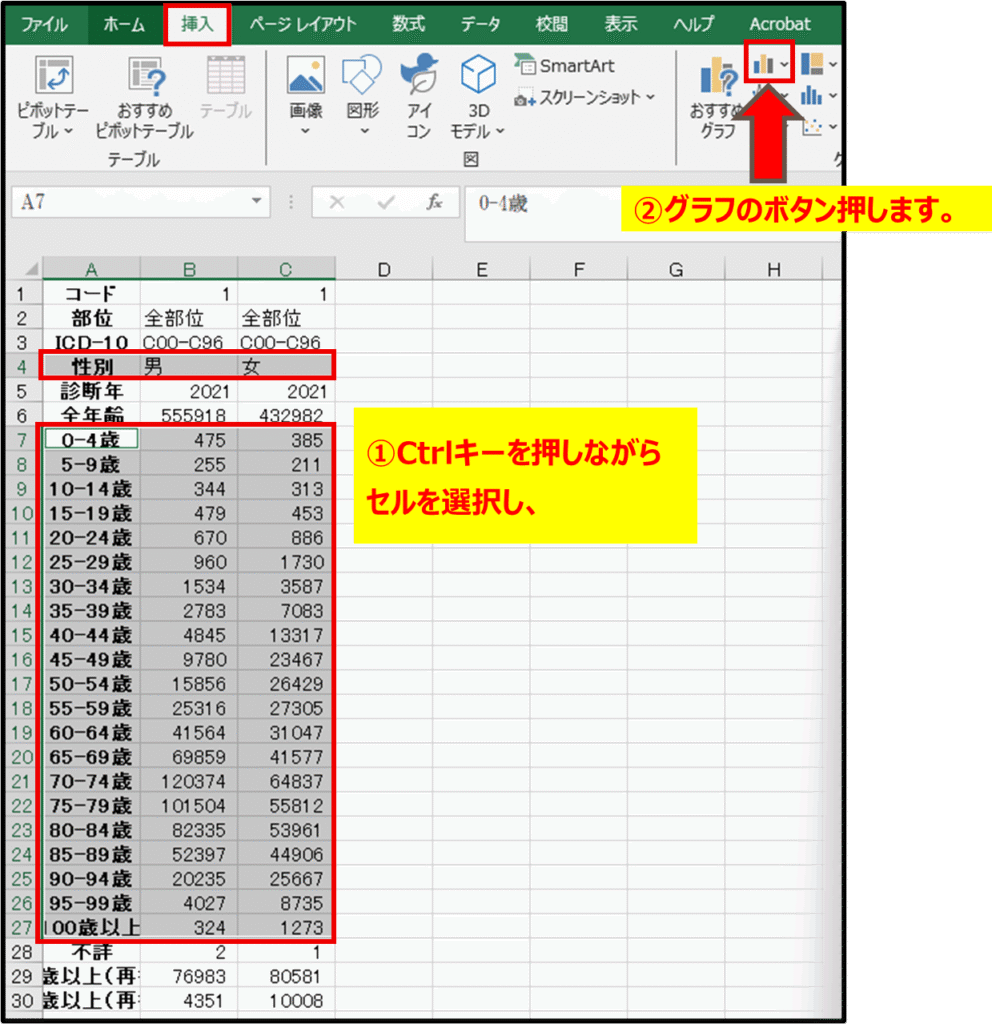 性別と年齢を選択したまま、「挿入」タブで、棒グラフを選択します。