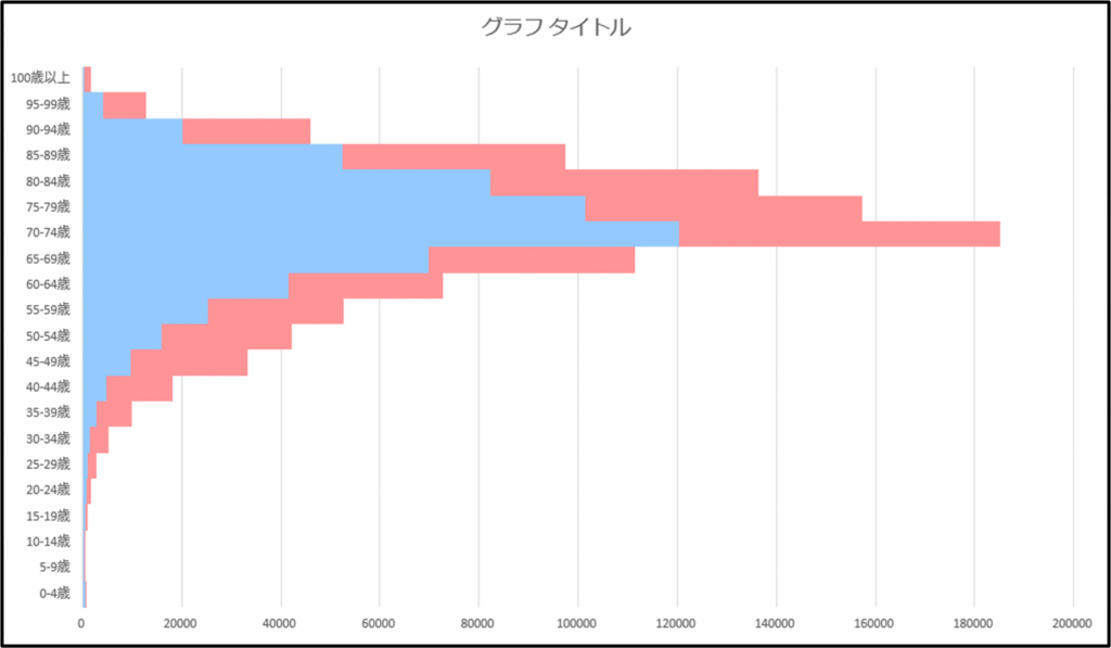 ここでは、男性が左向き、女性が右向きに棒グラフが開くピラミッドグラフを作成していきます。