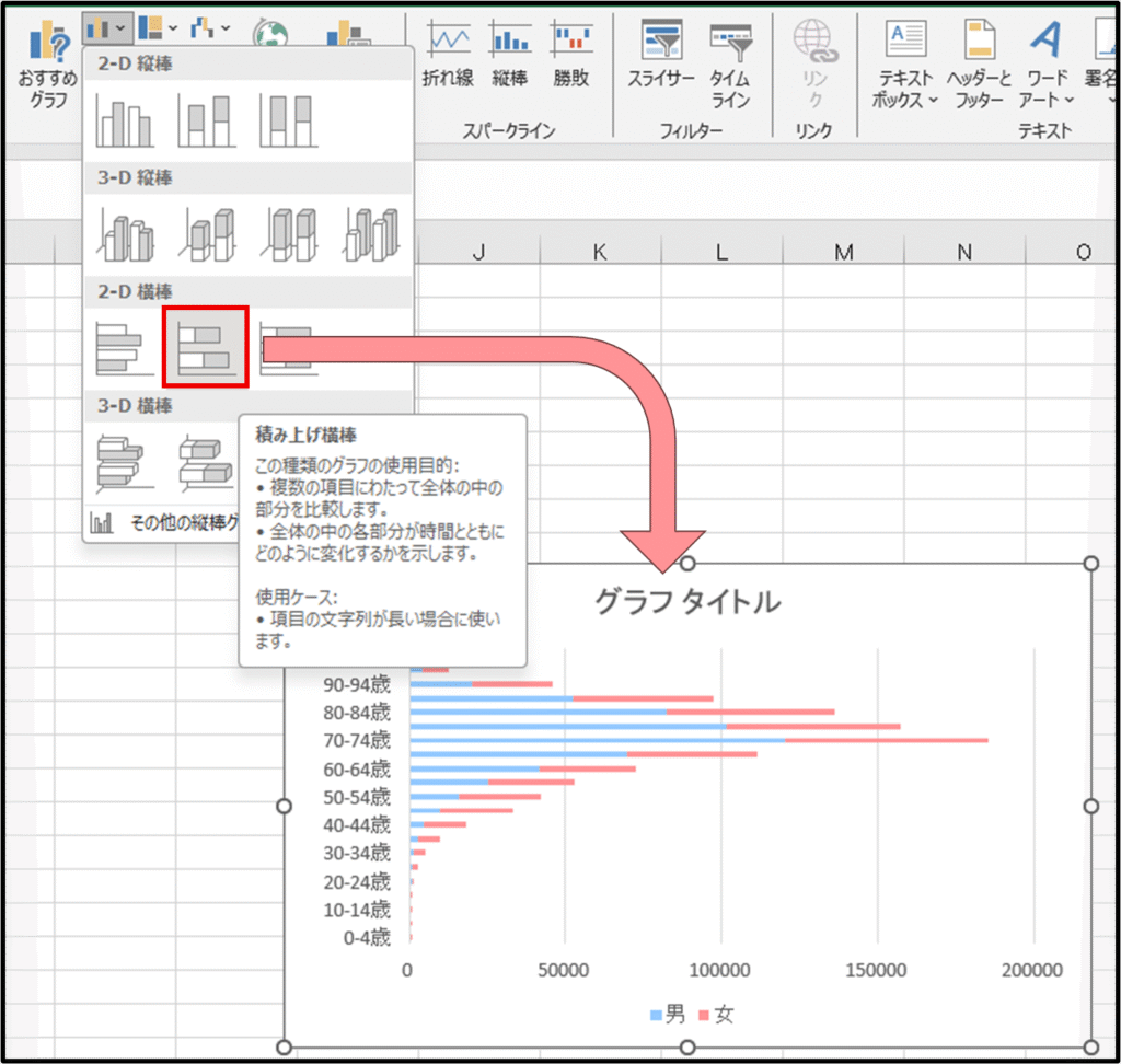 メニューから「挿入 → 積み上げ横棒グラフ」を選択