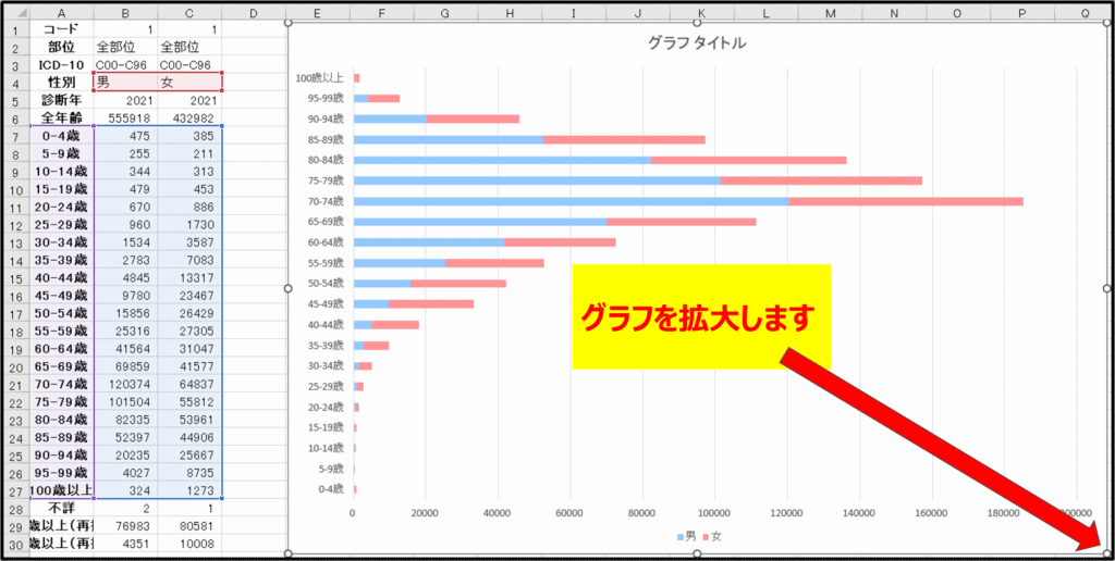 作られたグラフは小さいので、使いやすくするため拡大しましょう。