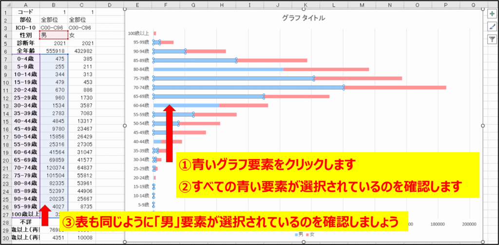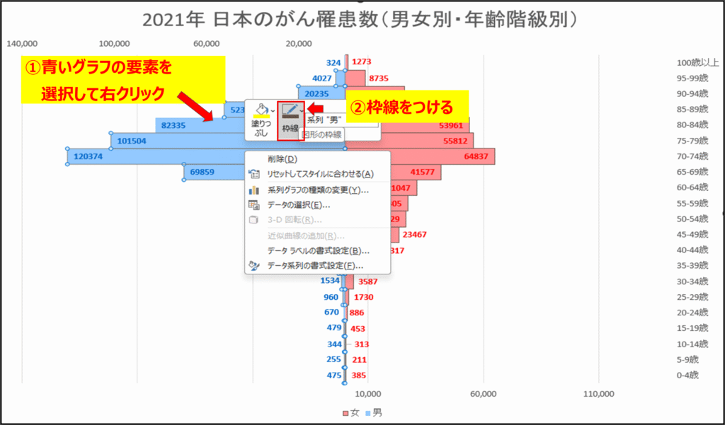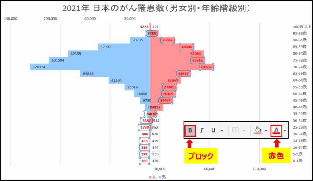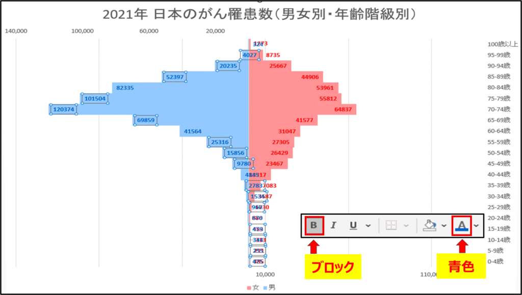 青いグラフの件数を選択します。すべてが選択されていることを確認してください。数字を太文字(ブロック)、青色に変更しましょう。これで、青い色の件数は男性の件数だということが一目りょう然になります。
