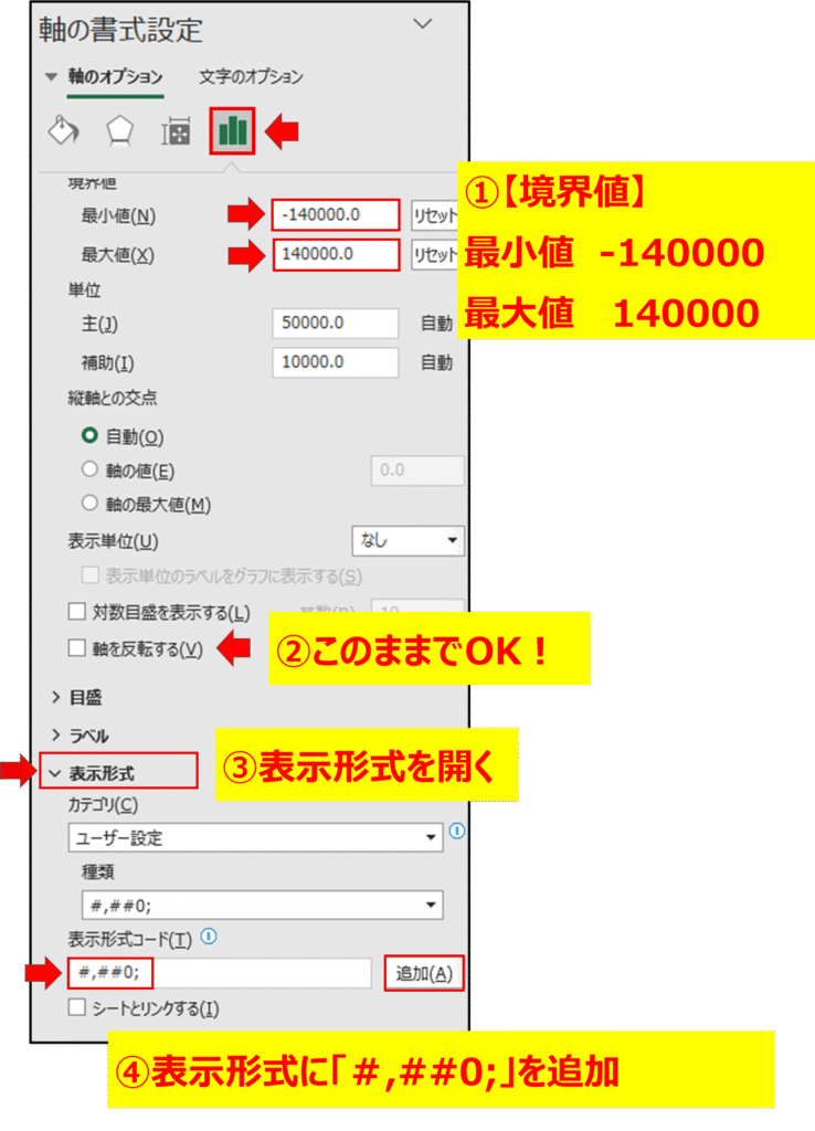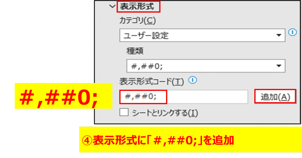 表示形式に「#,##0;」と入力して、追加ボタンを押しましょう。
