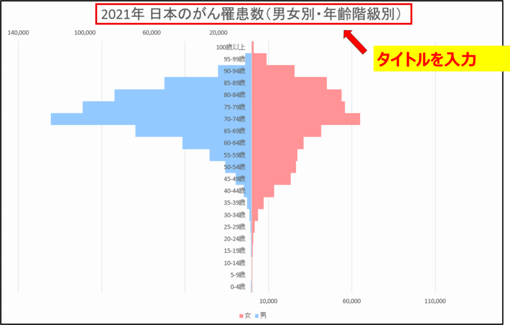 タイトルは「2021年 がん登録 男女別罹患数」など、内容が一目でわかるものにしましょう。