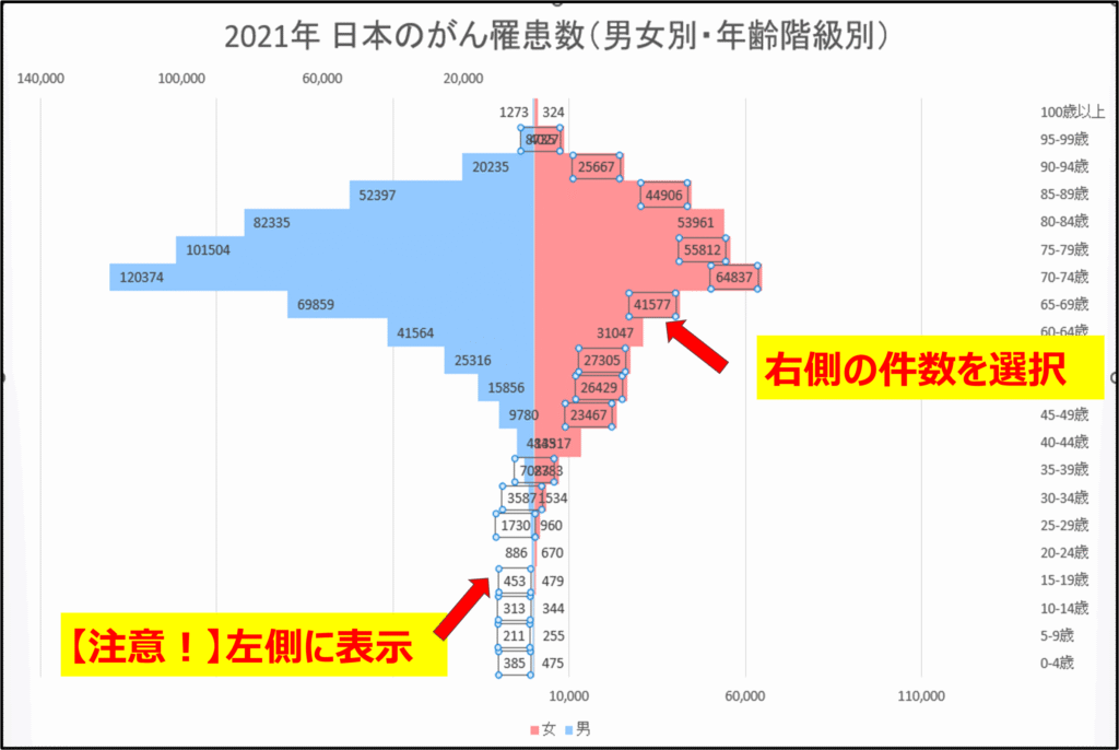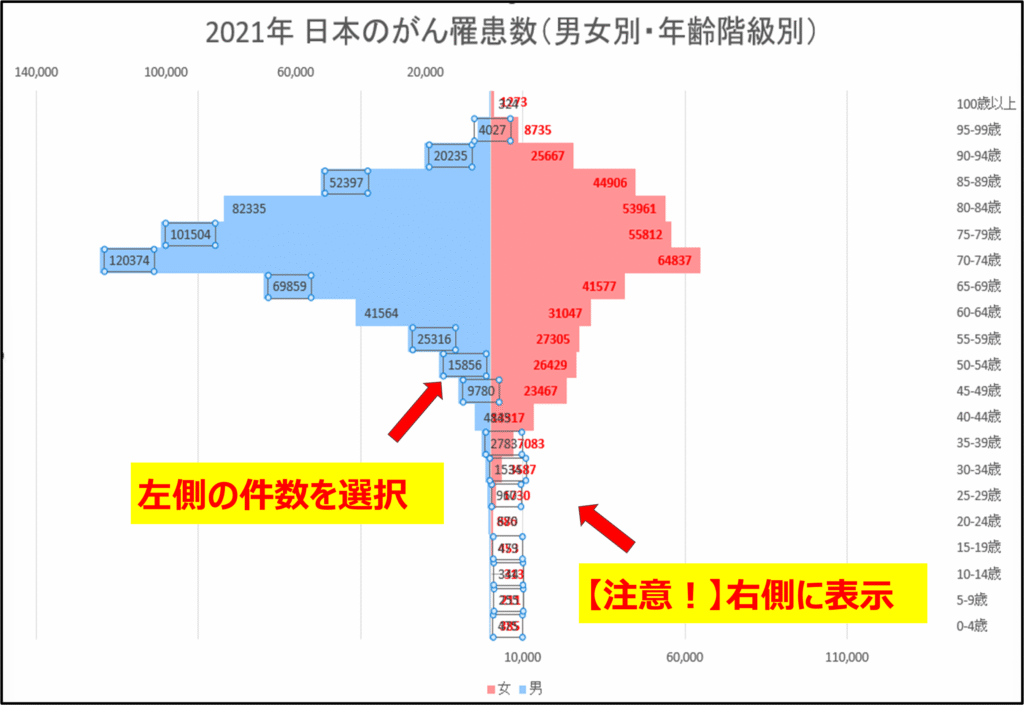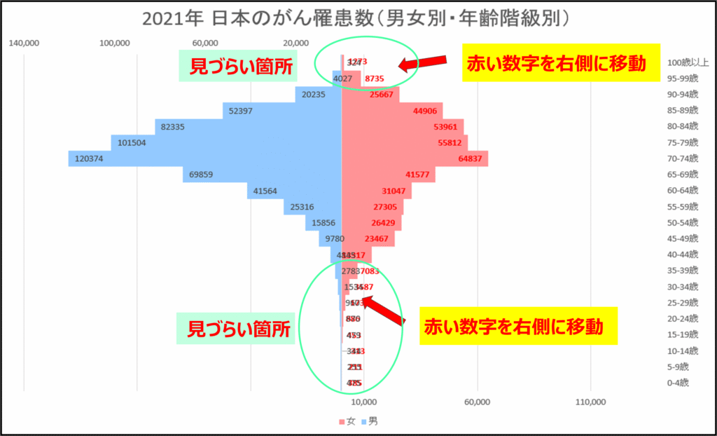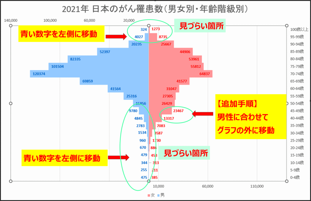 見づらい箇所の赤いの数字を棒グラフの右側へ移動しましょう。一つ一つ手作業になりますが、間違えないよう慎重に行ってください。あとで、男性の件数を左側に移動しますので、重なる所は、少しずらしておくと便利です。