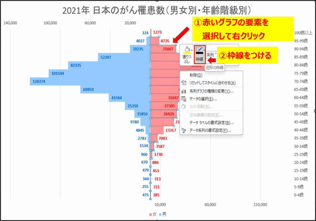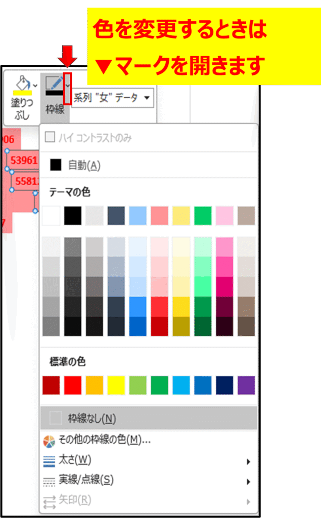 赤いグラフの要素を選択して、右クリックします。枠線を選択すると色を選択できます。