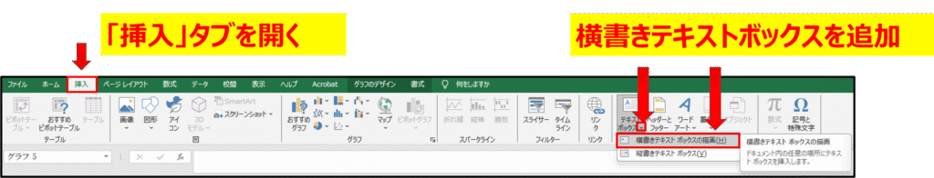「挿入 → テキストボックス」から「横書きテキストボックス」を追加しましょう。