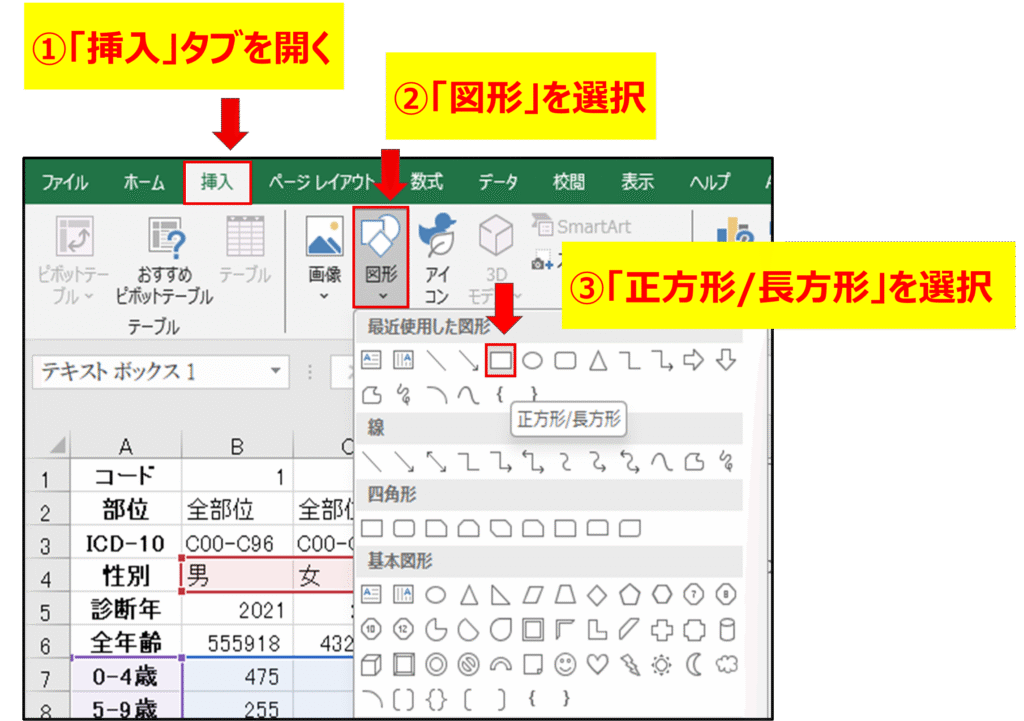 「挿入 → 図形 → 正方形/長方形」を選択しましょう。ここでは、四角を選びましたが、お好みで〇印などを選んでも大丈夫です。