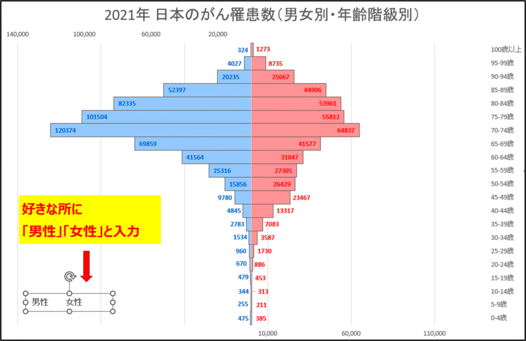 テキストボックスは、お好きなところに配置してください。ここでは、左下に「男性」・「女性」と入力しました。
