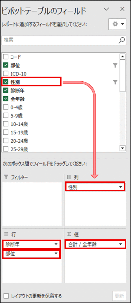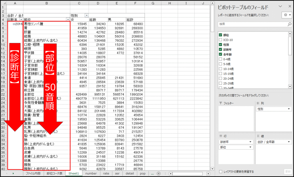 ピボットテーブルを作った最初の状態では、「診断年」は2016年から2021年、「部位」は50音順に並んでいます。ここでは「最新がん統計」と同じように、2021年のがん罹患数を順位で表示したいので、設定を変更していきます。