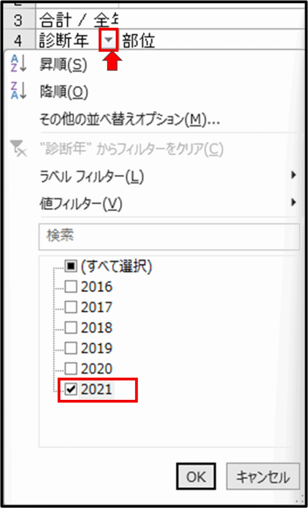 「診断年」セルの右側にあるリストボックスを開きます。すると、2016年から2021年までのチェックボックスが表示されます。2021年だけにして、その他のチェックを外しましょう。