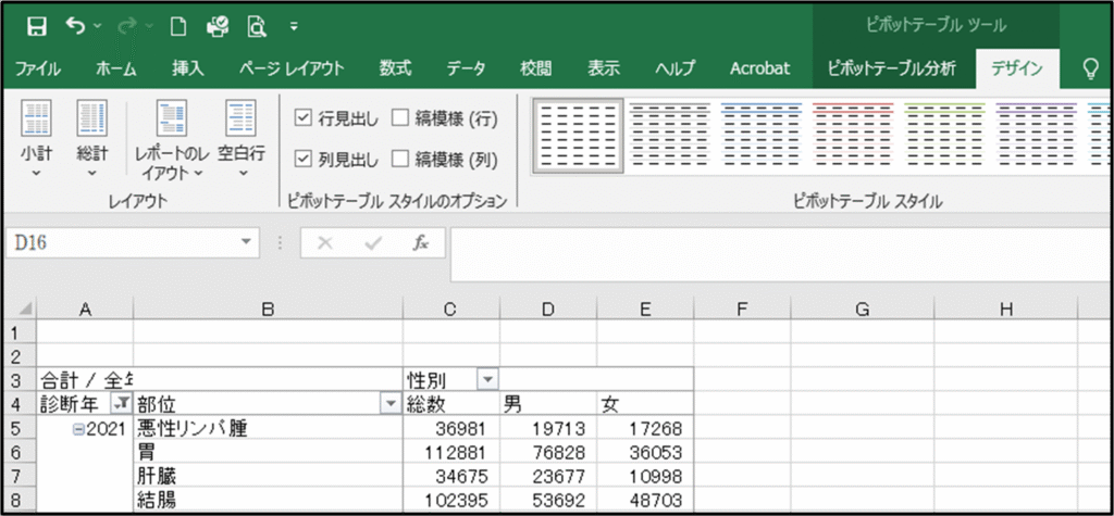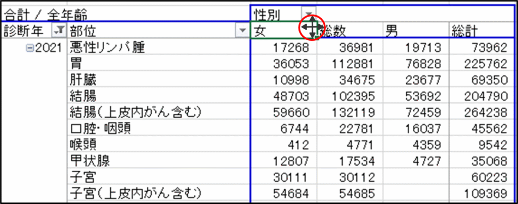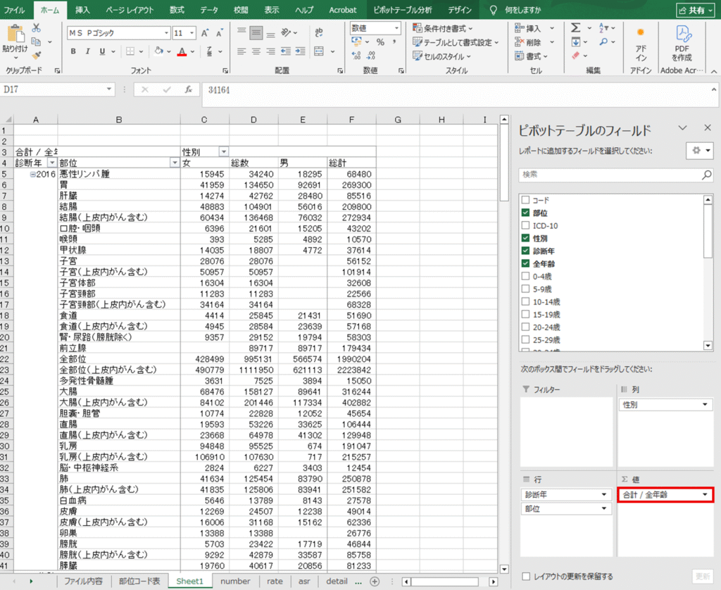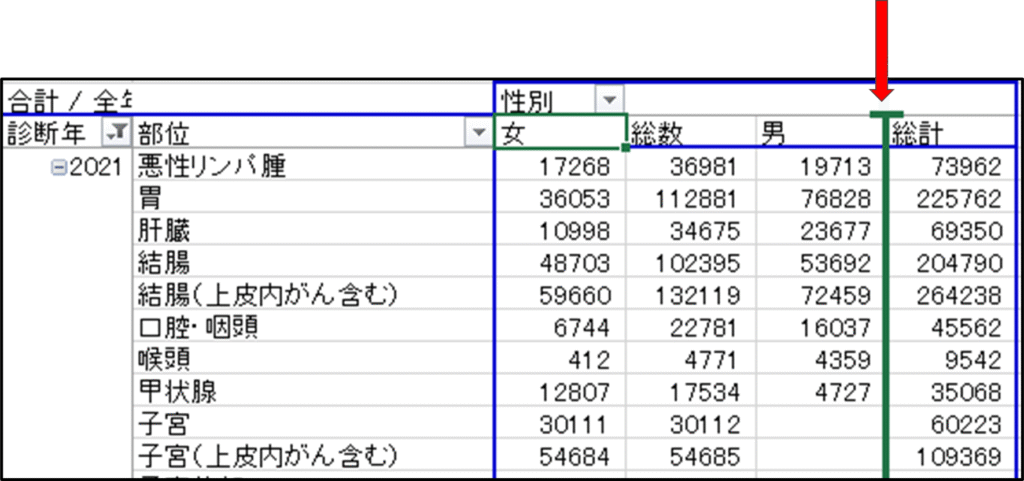 ピボットテーブルの左下「Σ値」が「合計/全年齢」になっています。これは、全年齢の人数を合計した数が表示されています。つまり、各部位に発生したがんの件数ということになります。