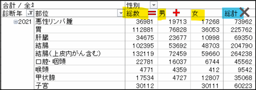 今の段階では、「総数」が多い順に並んでいます。左側の部位はその多い順の部位に並んでいます。ピボットテーブルを使ったことある人は、同様に「男」列や「女」列も多い順に並び替えることができるでしょう。「最新がん統計」の表と見比べて表記と同じ順になっていることをご確認ください。