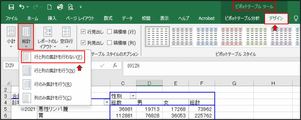 - 「総計」ボタンから「行と列の集計を行わない」を選択