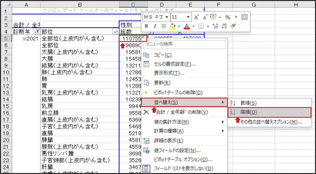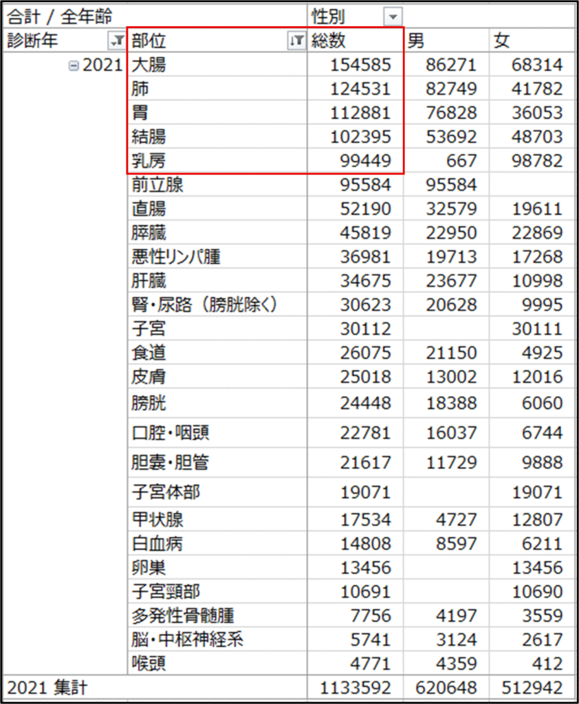 ここで作ったピボットテーブルを利用して表を作りましょう。国立がん研究センター「最新がん統計」を見本にして、罹患の多い順で表示していきます。