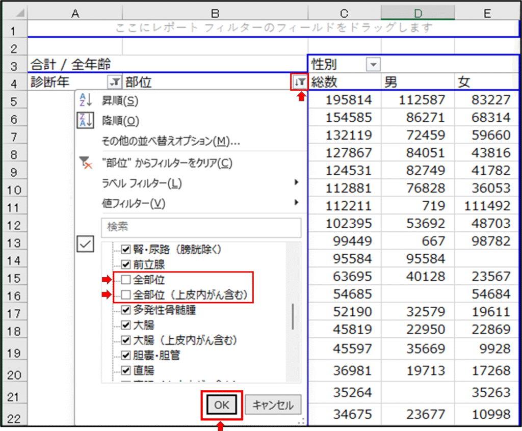 上図のように、「部位」セルに右側にあるフィルター機能を開きます。部位の一覧の中から「全部位」のチェックボックスを外しましょう。