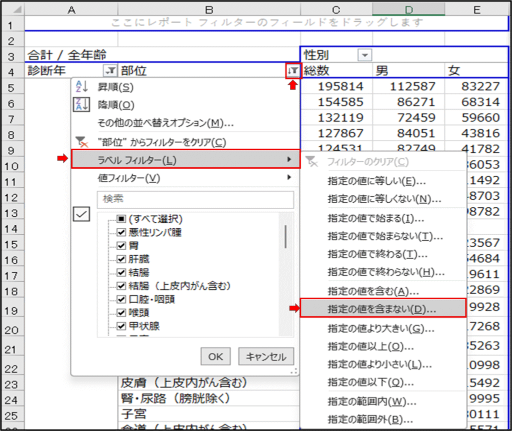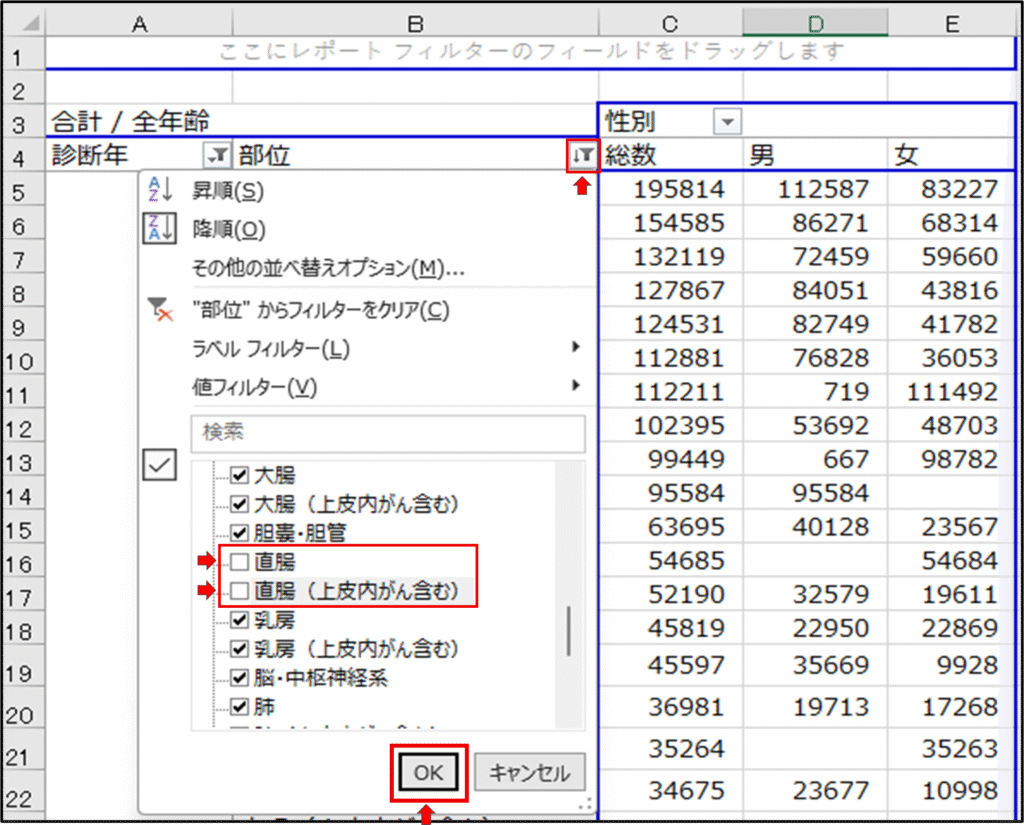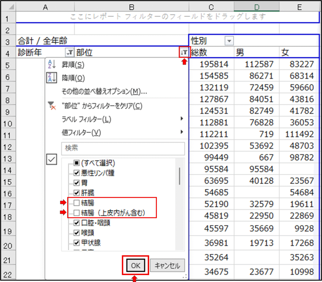 上図のように、「部位」セルに右側にあるフィルター機能を開きます。部位の一覧の中から「結腸」と「結腸(上皮内がん含む)」のチェックボックスを外しましょう。