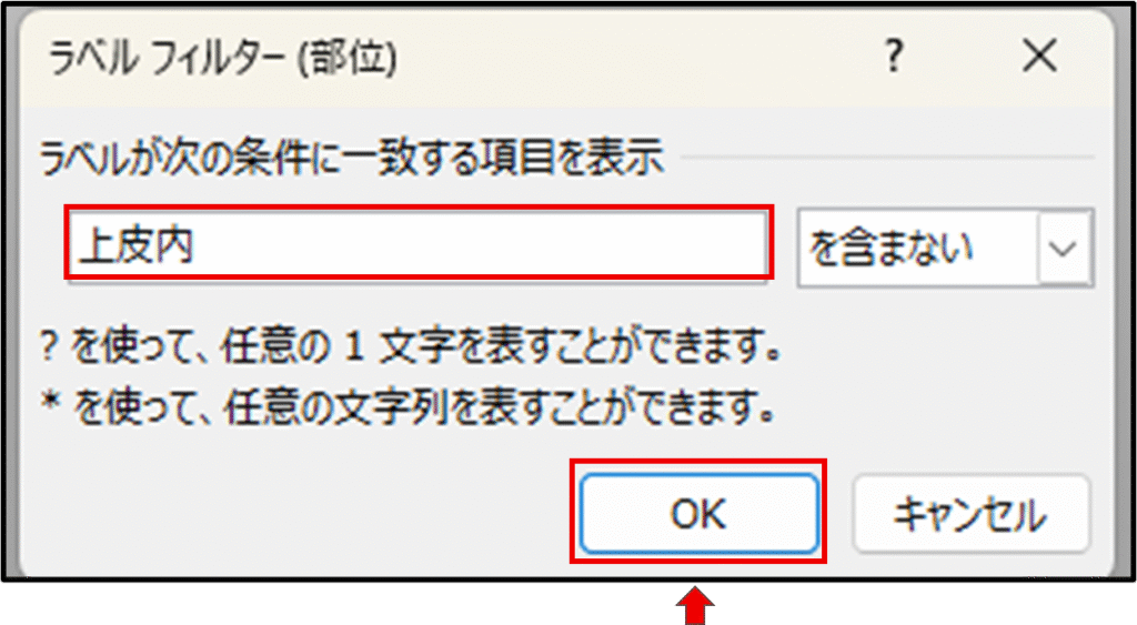 上図のように、「部位」セルに右側にあるフィルター機能を開きます。ラベルフィルターをクリックし、指定の値を含まないを選択しましょう。すると、小ウィンドウが開きます。ここに「上皮内」と入力すると、一覧からその文字を含むデータが自動で外れます。
