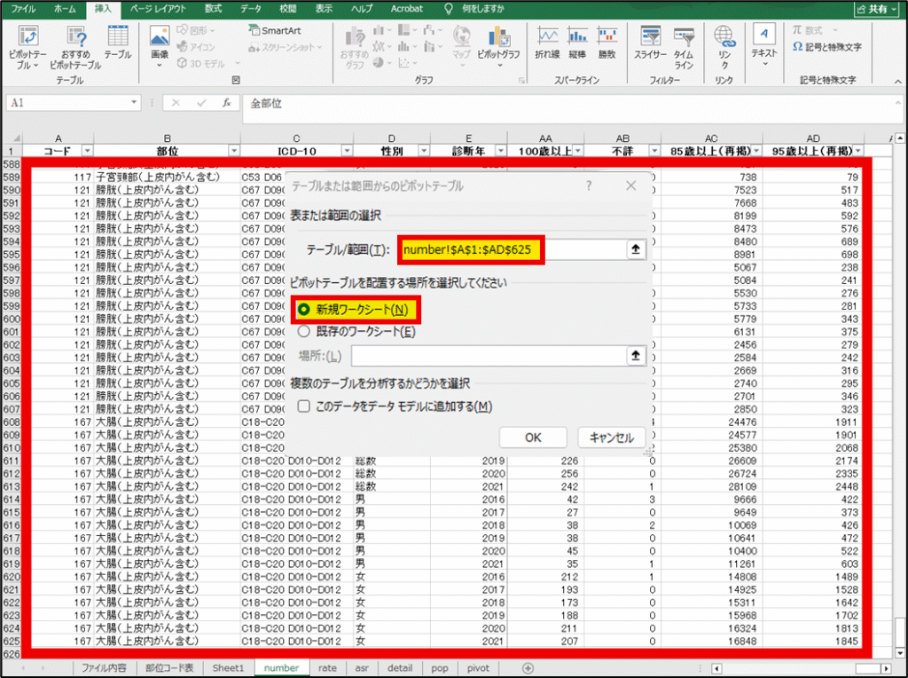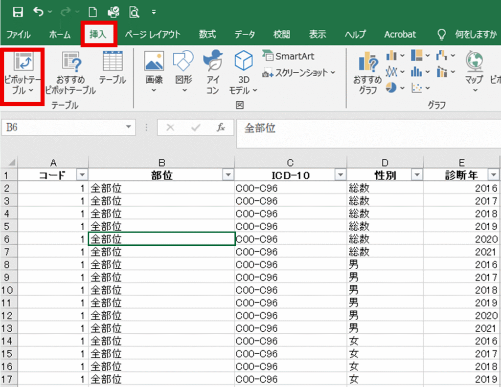 ①ピボットテーブルの挿入(Excelでがん統計分析用)