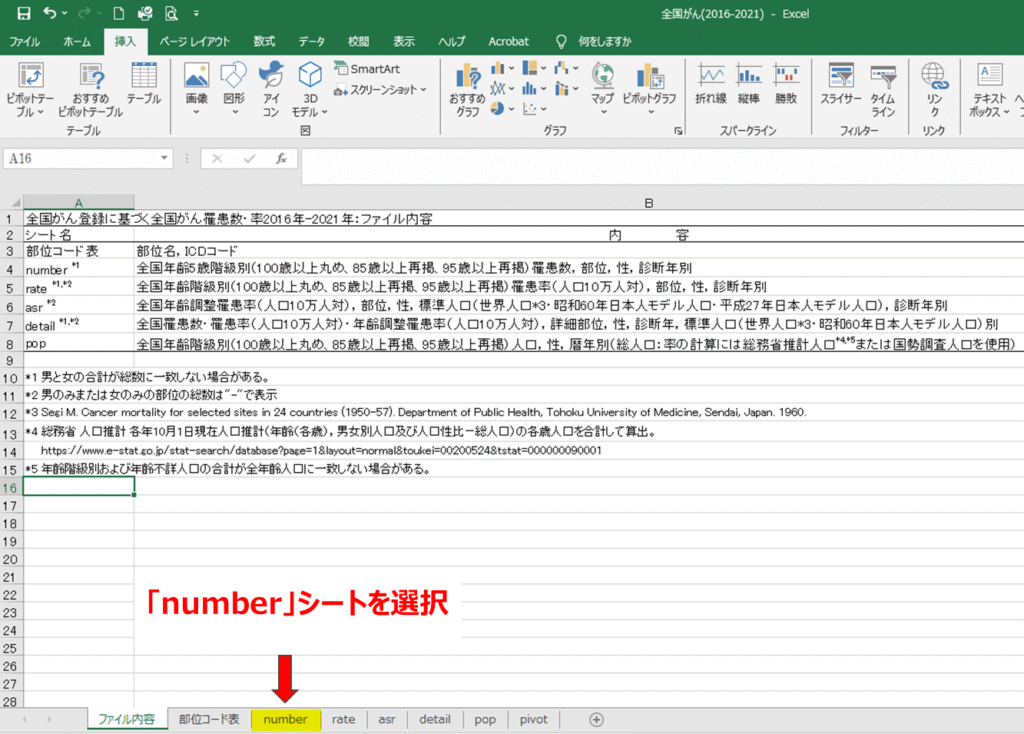 今回は、ダウンロードデータを使います。2.4【全国がん登録データをダウンロードする】の手順で、ファイル名「全国がん登録(2016-2021)」という名前で保存してあります。ダウンロードフォルダを開いて、保存されているファイルを開きましょう。