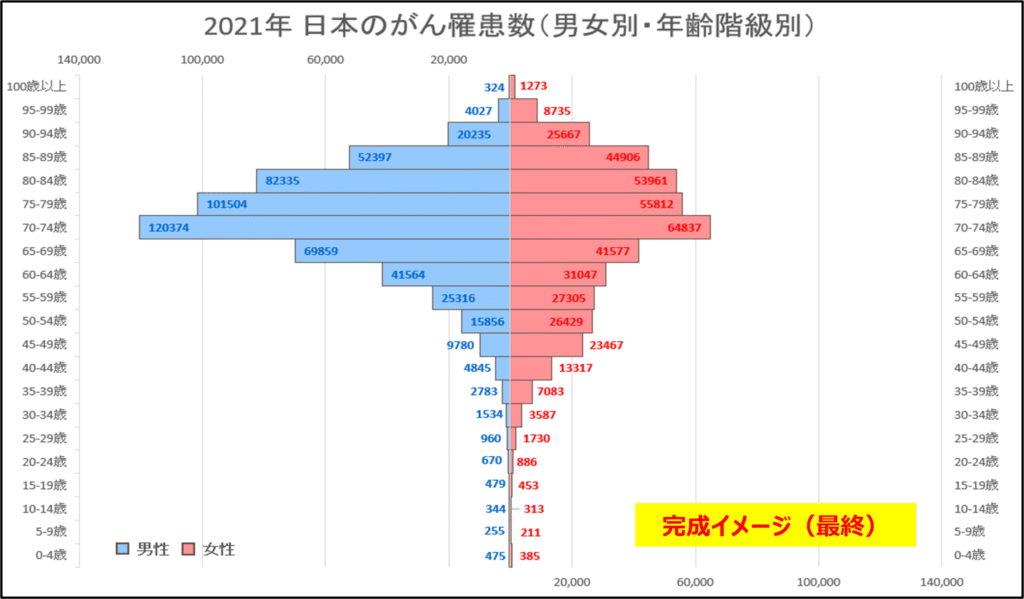 男女別・年齢階級別のがん罹患数データを、バタフライチャートにしよう!