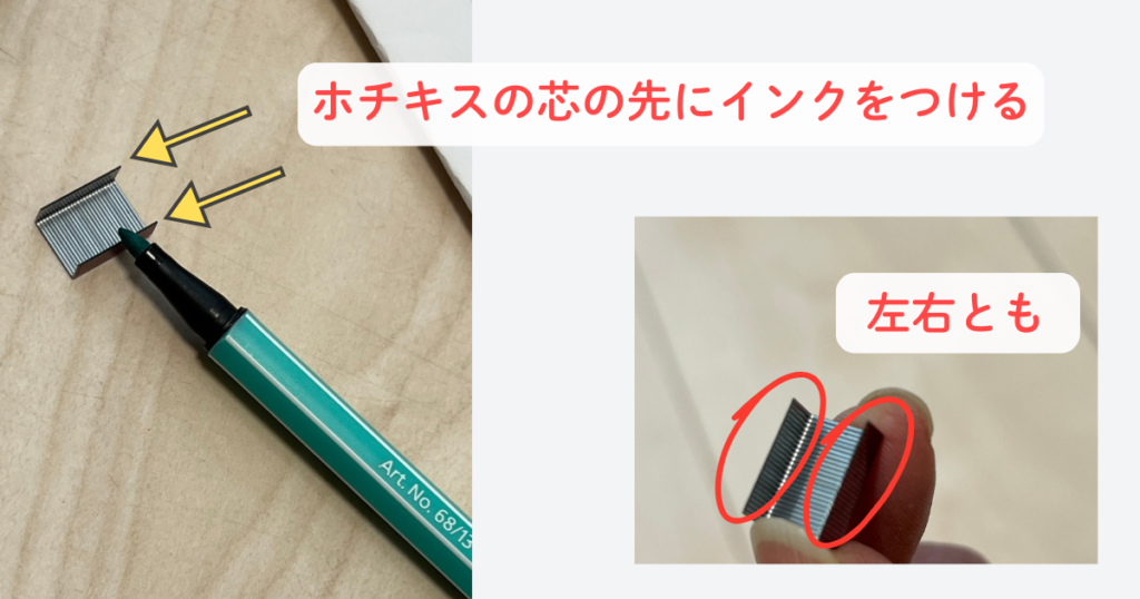 ホチキスの芯をひとかたまり出し、水性インクペンで芯に色をつけます。