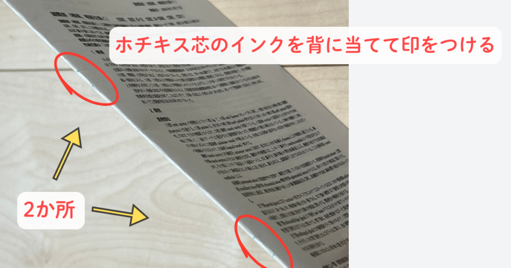 インクをつけたホチキス芯を、小冊子の背の部分に軽く当てて、印をつけます。