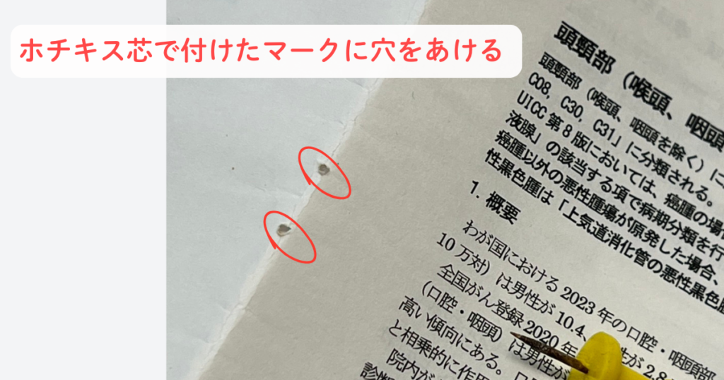 その後、つけた印に穴をあけ、ホチキスの芯を通します。
