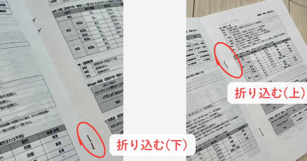 外側から通したホチキスの芯を、内側で下側 → 上側 の順に折り込みます。