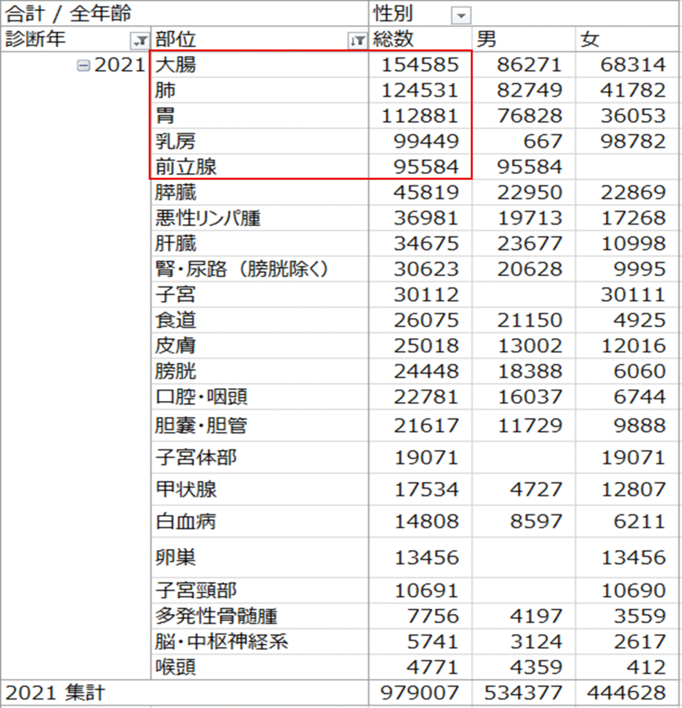 今回の記事では、国立がん研究センターが公開している「最新がん統計」に掲載された、がんの罹患数の順位を見本にしていきます。ダウンロードデータを用いて、同じ順位になるかを確認していきます。